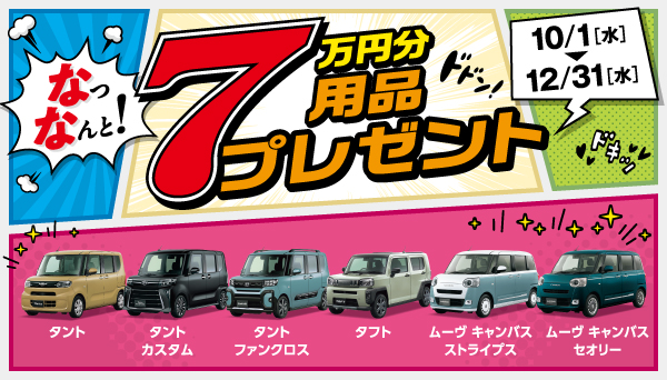 なっ、なんと!7万円分用品プレゼント!! 2025.10.01 タント、タントカスタム、タントファンクロス、タフト、ムーヴキャンバスをご成約いただくと、用品7万円をドドーンとプレゼント(^O^)/期間限定です!!ぜひダイハツ瀬谷にお越しください(*^^*) お知らせ一覧に戻る