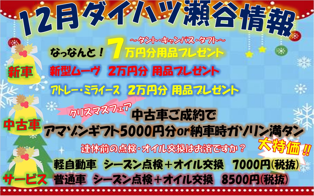 冬本番です(*´з`)寒~い冬にぴったりなHOTなイベント開催します(*^^)v嬉しい用品プレゼントなどなど新車も中古車も整備もドドンと特典満載です(^O^)/ダイハツ瀬谷に集まれー!!!